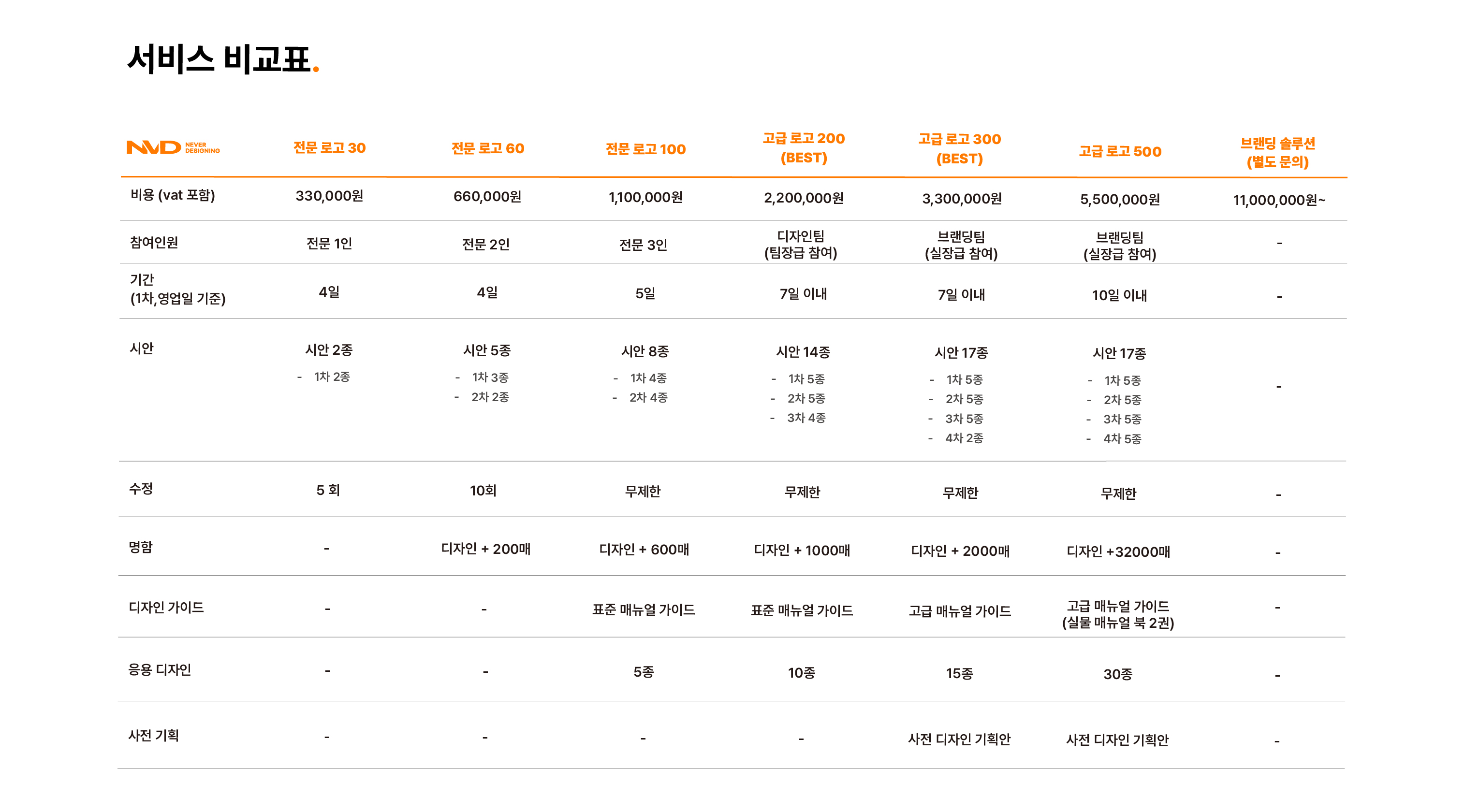 네버디자이닝은 투명한 정찰제를 지향합니다. 많은 업체가 견적 문의를 유도하여 가격을 불투명하게 운영하지만, 저희는 고객님의 혼란을 방지하고자 모든 서비스의 가격과 구성을 100% 공개하고 있습니다.
